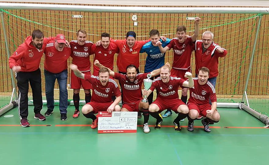 Nach souveräner Vorrunde am Donnerstag mit 3 Siegen besiegte man heute in der Zwischenrunde den TV Bunde mit 3:1 (Hinz, Malchus, O.Eucken) und spielte gegen Frisia Loga 0:0. Im anschließenden Halbfinale setzte man sich gegen das Überraschungsteam vom SV Ems Jemgum glatt mit 3:0 durch ( O.Eucken, Colak, Schulz).