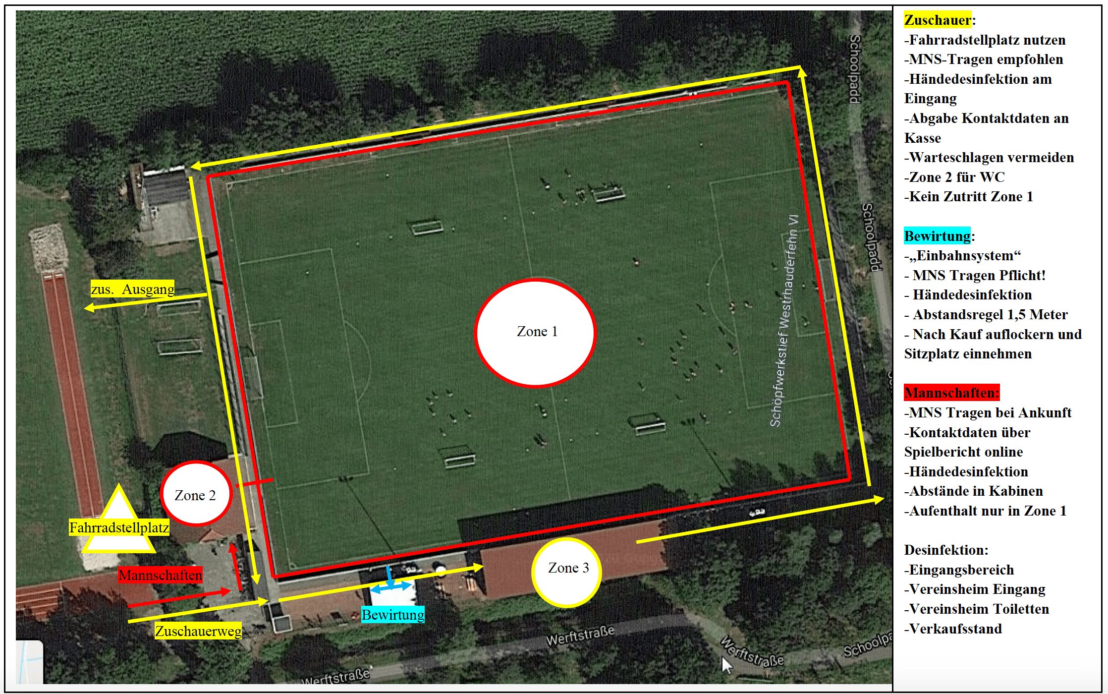 Hier finden Sie die Verhaltensregeln für Heimspiele auf der Sportanlage an der Werftstraße. Wir bitten alle Zuschauer:innen, sich dringend an diese Vorgaben zu halten, um Sportveranstaltungen mit Zuschauern während der Corona-Einschränkungen zu ermöglichen.